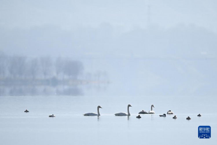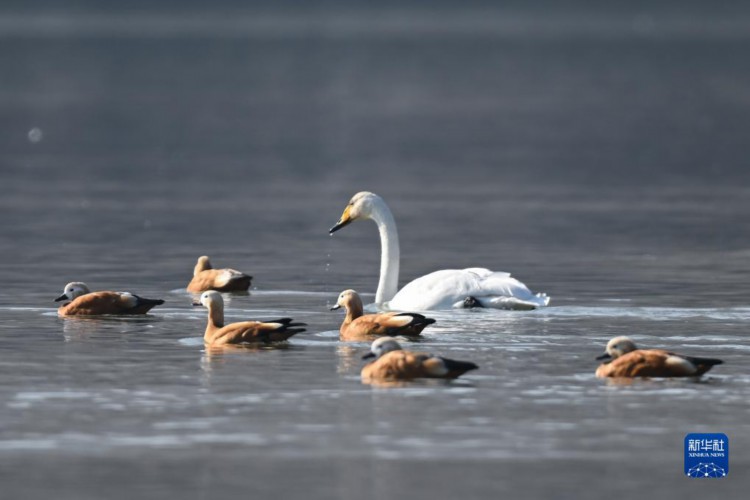 11月30日,天鵝與赤麻鴨在青海省海東市化隆回族自治縣群科鎮境內的黃河上游弋。 近日,青海省海東市化隆回族自治縣群科鎮的黃河上迎來近百只越冬的大天鵝,為冬日高原增添生機。近年來,青海省加大力度保護治理境內黃河流域,改善當地生態環境,為越冬候鳥提供良好棲息地。 新華社記者 張龍 攝