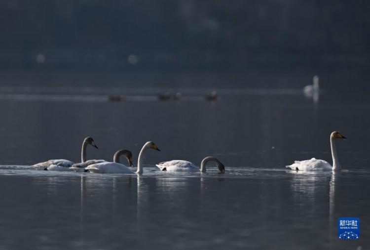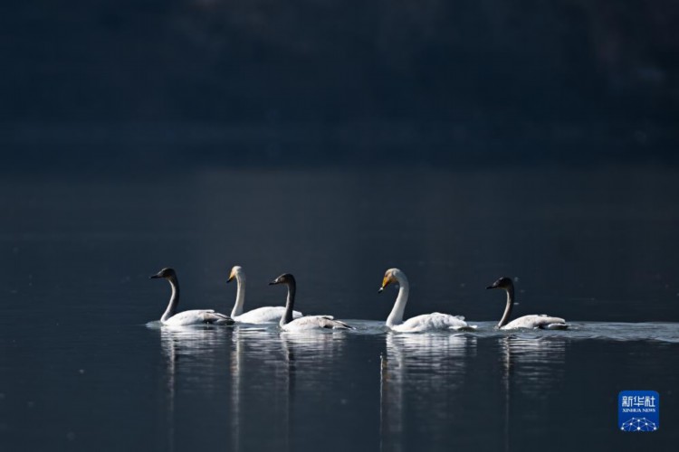 11月30日,天鵝在青海省海東市化隆回族自治縣群科鎮境內的黃河上游弋。 近日,青海省海東市化隆回族自治縣群科鎮的黃河上迎來近百只越冬的大天鵝,為冬日高原增添生機。近年來,青海省加大力度保護治理境內黃河流域,改善當地生態環境,為越冬候鳥提供良好棲息地。 新華社記者 張龍 攝