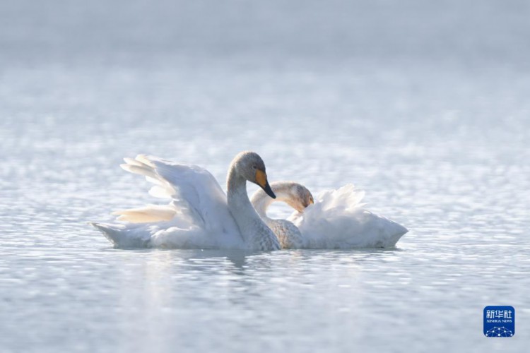 11月30日,兩只天鵝在青海省海東市化隆回族自治縣群科鎮境內的黃河上嬉戲。 近日,青海省海東市化隆回族自治縣群科鎮的黃河上迎來近百只越冬的大天鵝,為冬日高原增添生機。近年來,青海省加大力度保護治理境內黃河流域,改善當地生態環境,為越冬候鳥提供良好棲息地。 新華社記者 張龍 攝