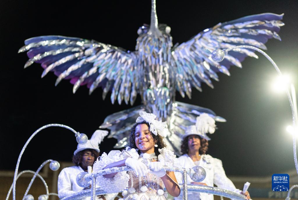 12月1日晚,在巴西里約熱內盧桑巴之城,來自蜂鳥舞校的演員參加桑巴游行。