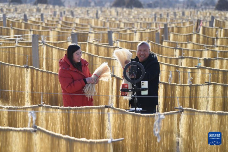 12月6日,河北省遷安市夏官營鎮梁龐莊村村民在當地一處粉條晾曬場直播推介粉條。