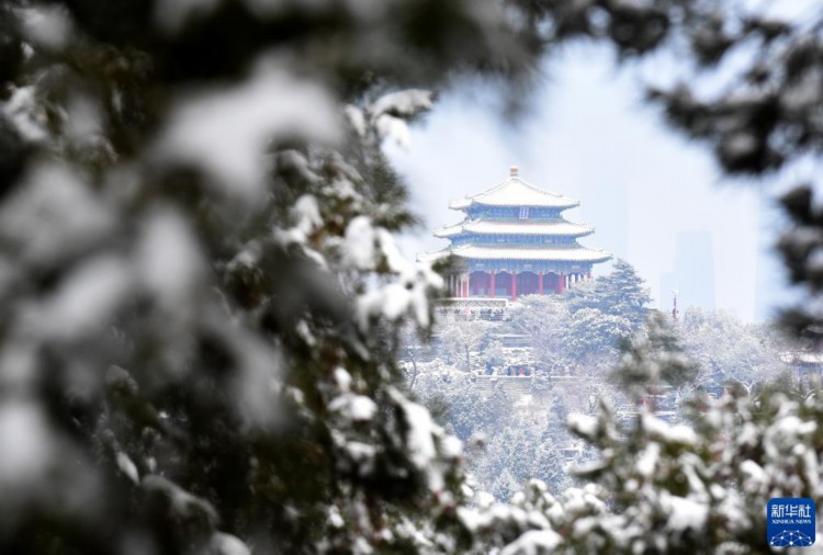 白雪掩映的景山公園萬春亭(12月11日攝)。