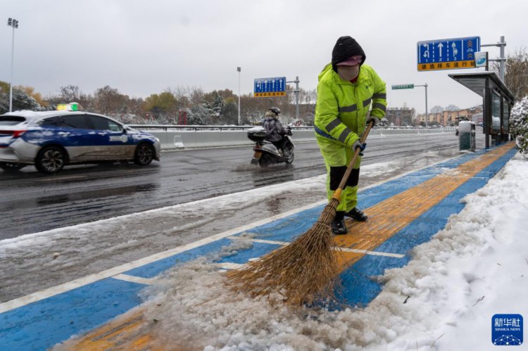 12月11日,濟(jì)南環(huán)衛(wèi)工人清掃道路積雪。 當(dāng)日,山東省濟(jì)南市出現(xiàn)降溫雨雪天氣。濟(jì)南市氣象臺(tái)已發(fā)布道路結(jié)冰黃色預(yù)警信號(hào)和寒潮黃色預(yù)警信號(hào),提醒公眾注意出行安全。 新華社記者 朱崢 攝