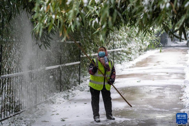 12月11日,園林工作人員在濟(jì)南泉城公園清理樹(shù)木積雪。 當(dāng)日,山東省濟(jì)南市出現(xiàn)降溫雨雪天氣。濟(jì)南市氣象臺(tái)已發(fā)布道路結(jié)冰黃色預(yù)警信號(hào)和寒潮黃色預(yù)警信號(hào),提醒公眾注意出行安全。 新華社記者 朱崢 攝