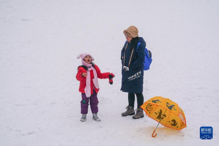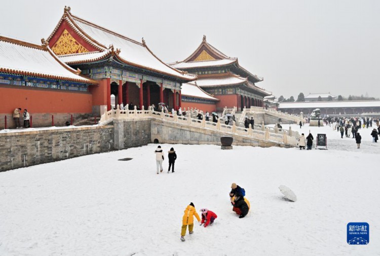 12月13日,小朋友和家長在故宮的雪地上玩耍。 當日,北京再次迎來大雪天氣,不少游客前往故宮游玩賞雪。 新華社記者 陳曄華 攝