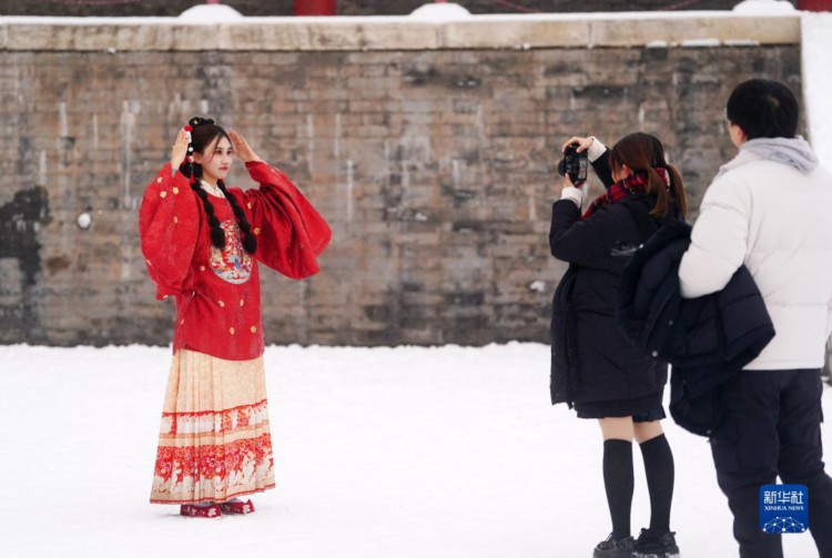 12月13日,游客穿著古裝在故宮里拍照。 當日,北京再次迎來大雪天氣,不少游客前往故宮游玩賞雪。 新華社記者 陳曄華 攝