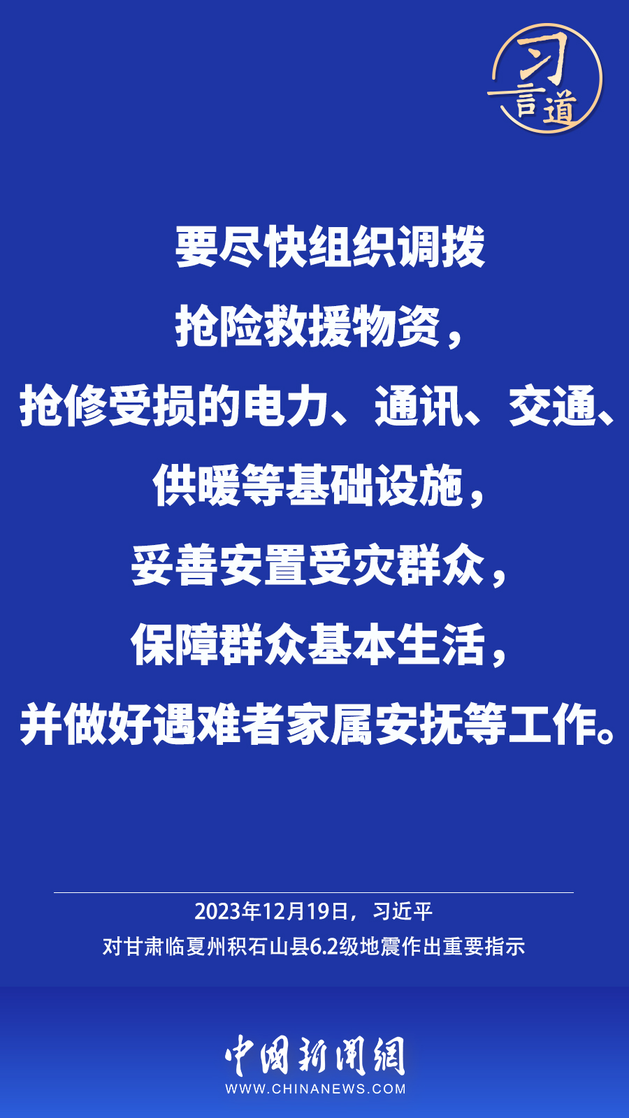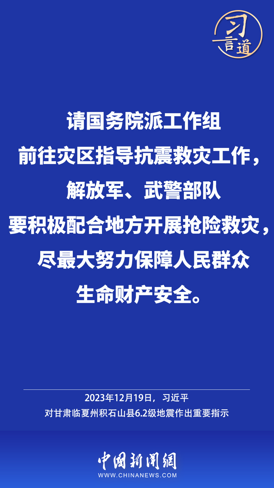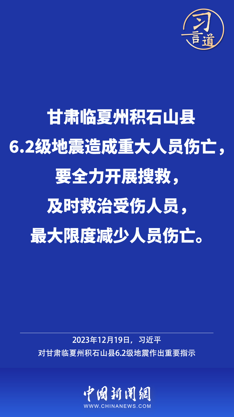 北京時間12月18日23時59分,甘肅臨夏州積石山縣發生6.2級地震,震源深度10公里。地震發生后,中共中央總書記、國家主席、中央軍委主席習近平高度重視并作出重要指示——