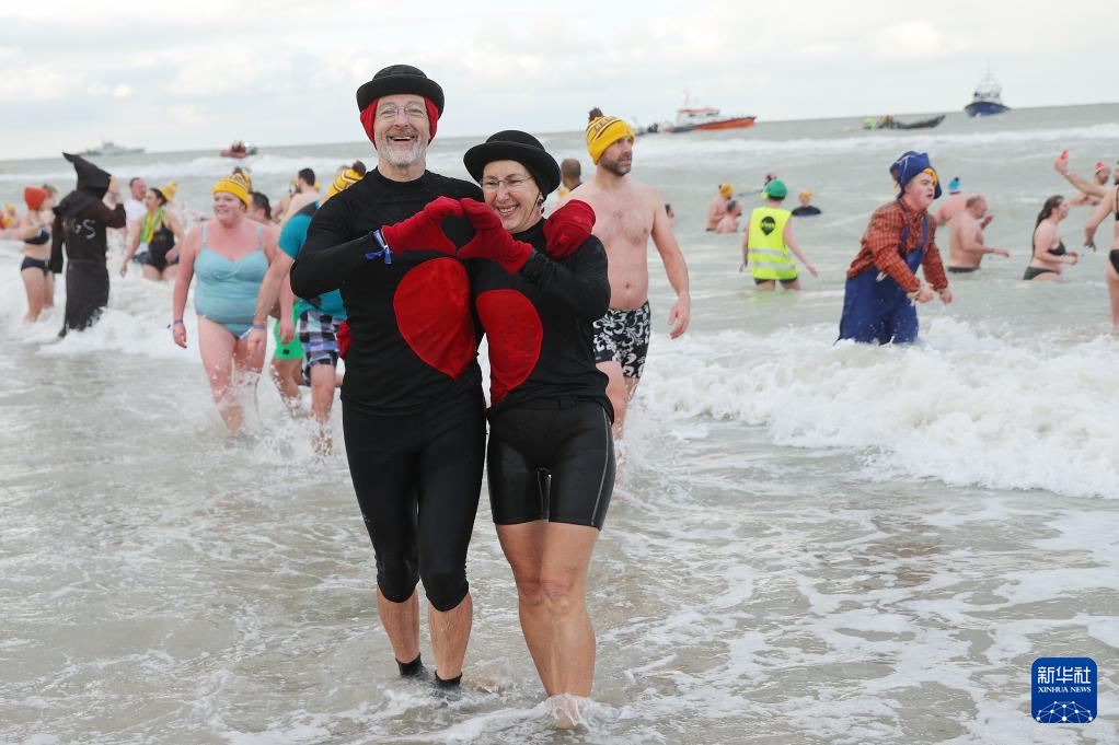 當日,比利時港口城市奧斯坦德舉行傳統的“跳海慶新年”活動,眾多參加者身著各式服裝跳進北海,期盼在新的一年擁有強健的體魄。