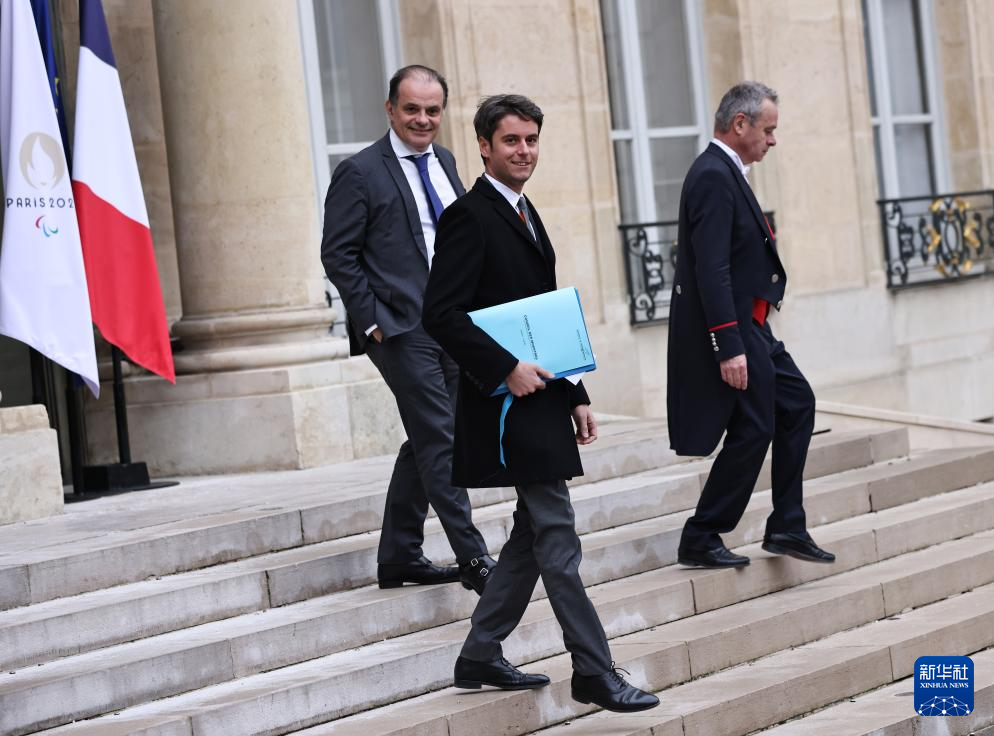 1月12日,法國總理阿塔爾(中)在巴黎愛麗舍宮出席新一屆政府首次內(nèi)閣會議后離開。