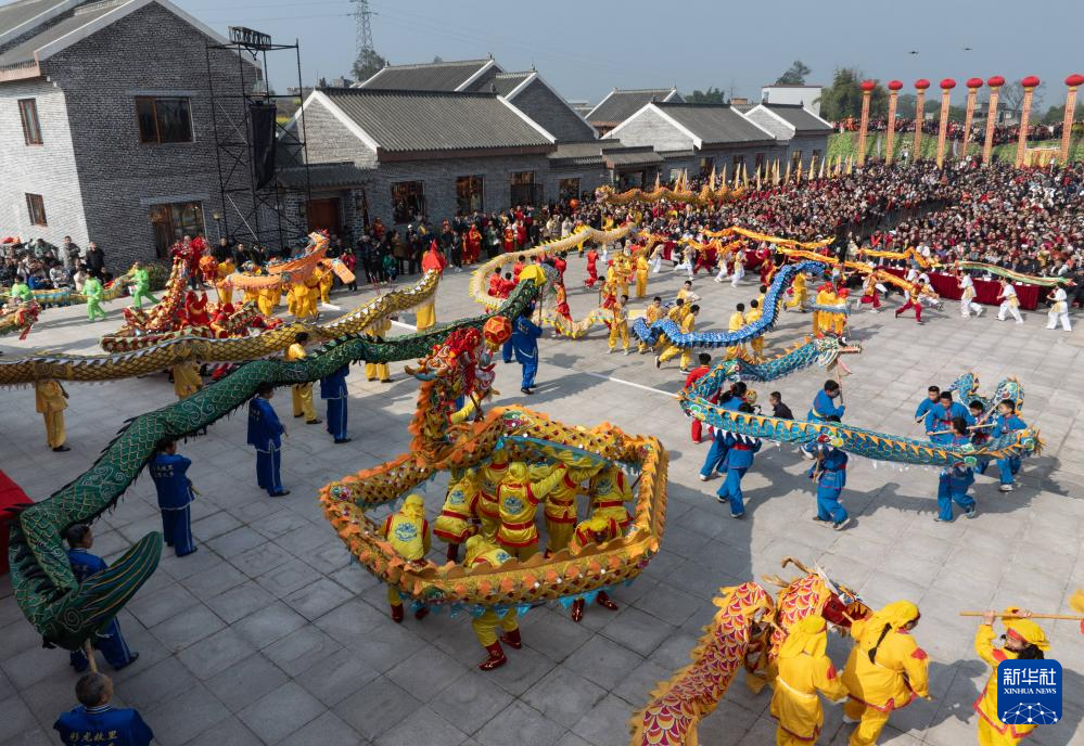 3月11日,在瀘縣屈氏莊園前,多支彩龍隊進行舞龍表演(無人機照片)。 當日,四川省瀘縣在全國重點文物保護單位——屈氏莊園前舉行了四川·瀘縣第九屆“二月二 龍抬頭”民俗文化節暨龍文化宣傳日活動。 近年來,有“中國龍文化之鄉”美譽的四川省瀘縣將傳統民俗文化和鄉村文化旅游結合,深入開展“龍文化”系列民俗活動,“二月二龍抬頭”“千龍千獅鬧新春”“龍舞鬧元宵”等主題活動豐富了鄉村文化生活,受到群眾和游客的喜愛。 新華社記者 江宏景 攝pagebreak