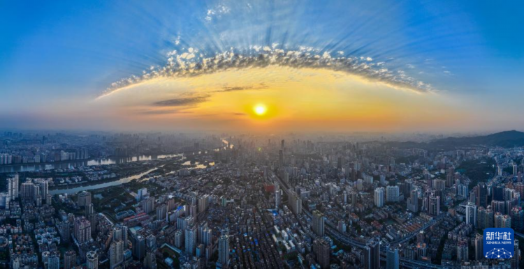 這是3月12日在廣州拍攝的景色,夕陽和晚霞宛若天空之眼(無人機照片)。