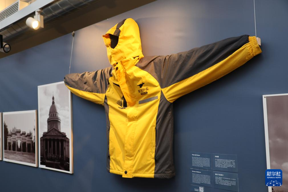 這是3月23日在法國巴黎舉辦的“甲子情深——中法百姓故事展”上拍攝的法國紀錄片導演雅克·馬拉泰爾在中國拍攝紀錄影片《北京人:人類最后的秘密》期間購置的外賣員制服。