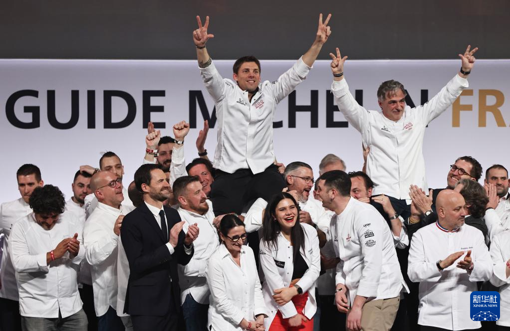 2024《米其林指南》法國版出爐 3月18日,在法國中央-盧瓦爾河谷大區圖爾市舉行的2024《米其林指南》法國版發布典禮上,獲頒米其林三星的法國廚師法比安·菲埃(上左)和熱羅姆·邦克泰爾(上右)振臂慶祝。 18日,2024《米其林指南》法國版在法國中央-盧瓦爾河谷大區圖爾市發布,新增兩家米其林三星餐館,8家米其林二星餐館,52家米其林一星餐館。 新華社記者 高靜 攝