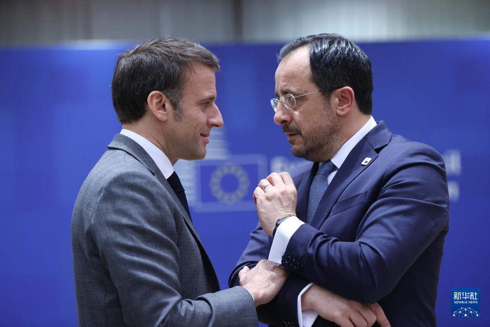 歐盟峰會在比利時布魯塞爾舉行 3月21日,在比利時布魯塞爾,法國總統馬克龍(左)和塞浦路斯總統赫里斯托祖利季斯出席歐盟峰會。 歐盟峰會當天在比利時首都布魯塞爾舉行。 新華社記者 趙丁喆 攝