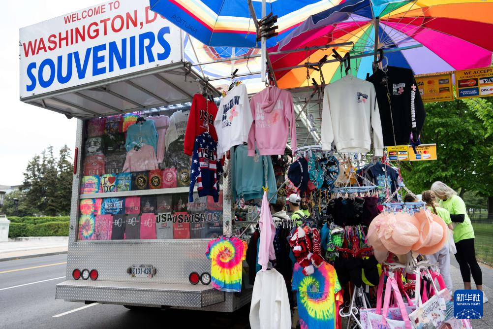 4月25日,在美國首都華盛頓,游客在一處白宮附近的紀念品攤位前選購商品。 美國商務部25日公布的首次預估數據顯示,今年第一季度美國實際國內生產總值(GDP)按年率計算增長1.6%,增幅較去年第四季度明顯收窄。 新華社記者 劉杰 攝