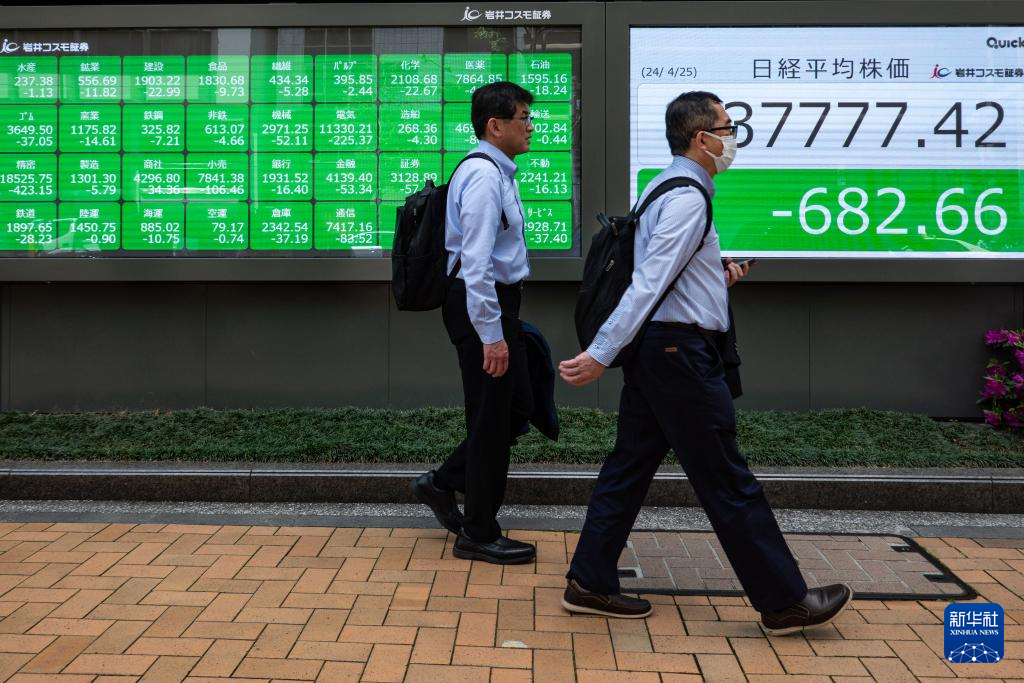 東京股市大幅回落 4月25日,在日本東京,行人走過股市信息顯示屏。 日本東京股市兩大股指25日低開低走、大幅回落。日經225種股票平均價格指數收盤下跌2.16%,東京證券交易所股票價格指數下跌1.74%。至收盤時,日經股指下跌831.60點,收于37628.48點;東證股指下跌47.20點,收于2663.53點。 新華社記者 張笑宇 攝