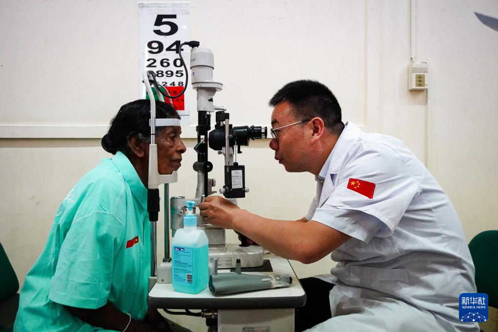 中國醫療隊幫助斯里蘭卡100名白內障患者重見光明 4月25日,在斯里蘭卡科倫坡,昆明醫科大學第一附屬醫院醫生鐘華(右)為患者進行術后復查。 中國云南省醫療隊斯里蘭卡“光明行”活動儀式25日在科倫坡蘭卡醫院舉行。本次活動由中國駐斯里蘭卡大使館指導,云南省人民對外友好協會、斯中社會文化合作協會主辦,來自昆明醫科大學第一附屬醫院的8名醫護人員在22日至26日期間,為100名斯里蘭卡本地患者進行手術治療。 新華社記者 陳冬書 攝