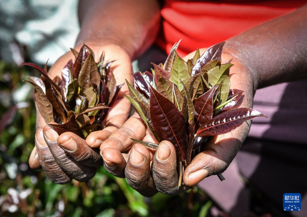 5月6日,在肯尼亞穆拉雅郡的一處紫茶園,茶農展示采摘下來的紫茶。