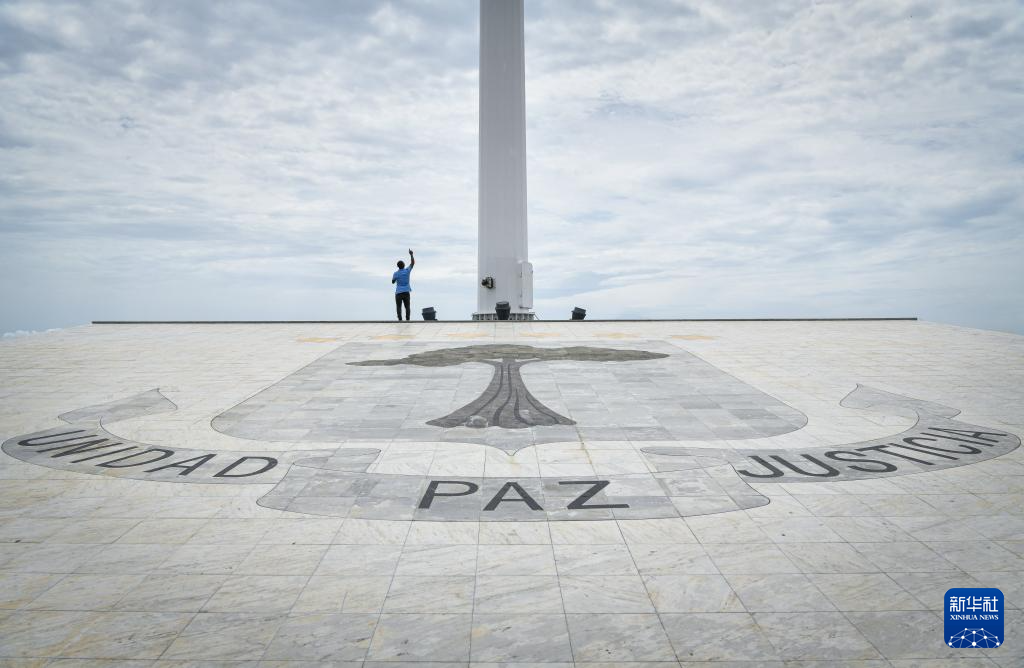 這是5月18日在赤道幾內(nèi)亞首都馬拉博拍攝的赤道幾內(nèi)亞廣場一隅,廣場中央的旗桿底座鐫刻有赤道幾內(nèi)亞國徽以及“團結(jié)、和平、正義”國家格言字樣。