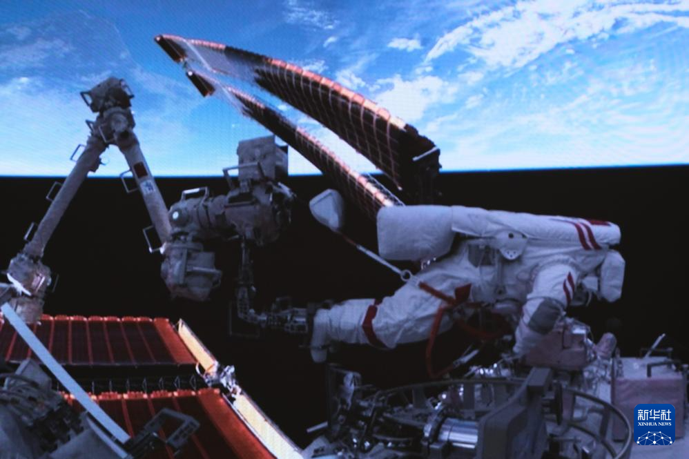 5月28日在北京航天飛行控制中心拍攝的神舟十八號航天員在空間站組合體艙外作業的畫面。 當日,神舟十八號乘組航天員葉光富、李聰、李廣蘇密切協同,在空間站機械臂和地面科研人員的配合支持下,完成了空間站空間碎片防護裝置安裝、艙外設備設施巡檢等任務。航天員葉光富、李廣蘇已安全返回問天實驗艙,出艙活動取得圓滿成功。航天員葉光富再度漫步太空,航天員李廣蘇首次執行出艙活動任務。 新華社記者 李杰 攝 |
