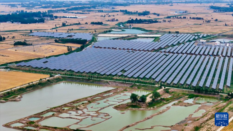 6月4日拍攝的嘉祥縣梁寶寺鎮利用采煤塌陷區建設的華能嘉祥梁寶寺光伏項目(無人機照片)。