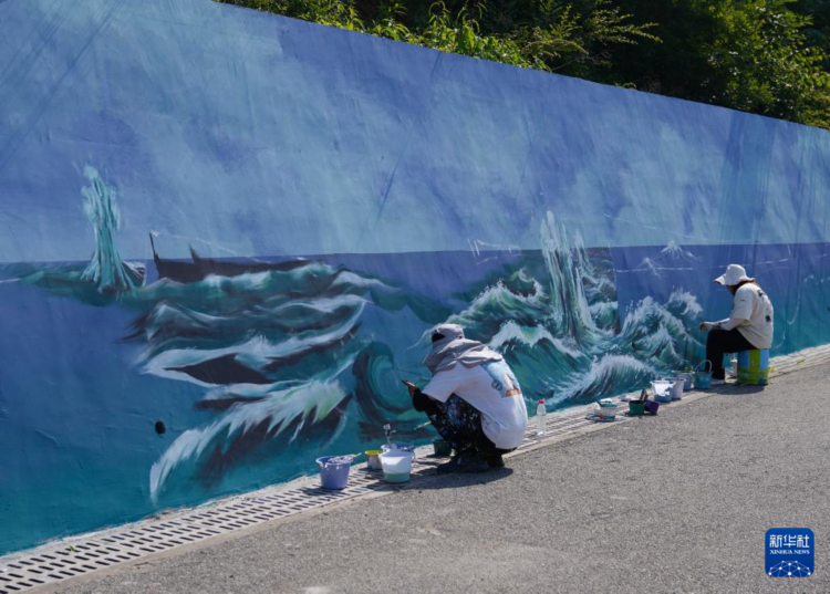 6月17日,工作人員在丹東大鹿島進行墻體彩繪。