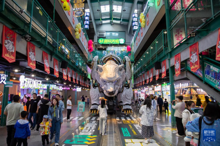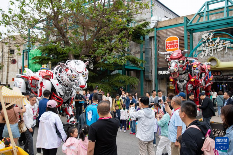 5月25日,游客在大連熊洞街參觀仿生機械巨熊。