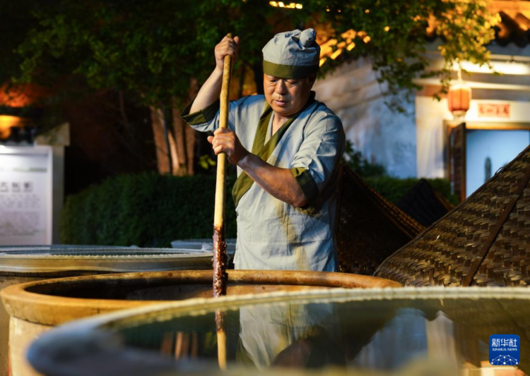 6月12日,在位于營口老街的營口大醬園內,工作人員展示大醬制作工藝。