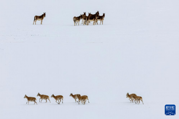 一群藏野驢在雪地中注視著遷徙的藏羚羊(5月8日攝)。