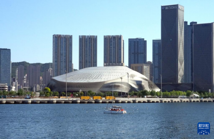 從海上遠眺第十五屆夏季達沃斯論壇主會場大連國際會議中心(6月16日攝)。