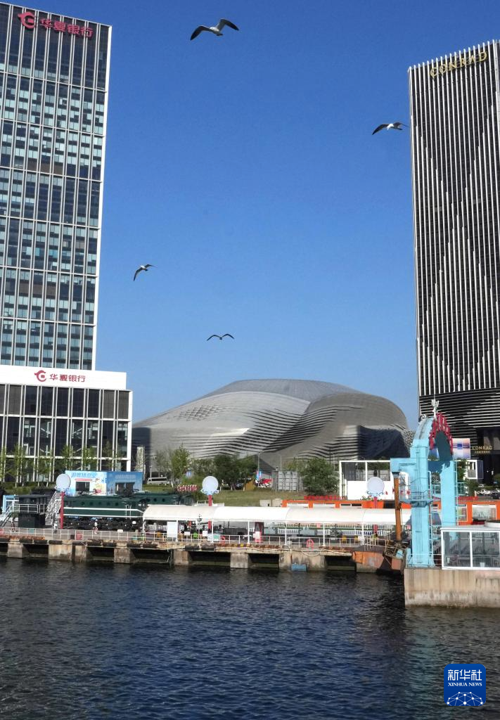 從海上遠眺第十五屆夏季達沃斯論壇主會場大連國際會議中心(6月16日攝)。