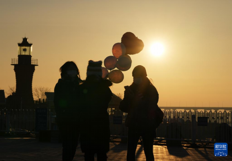 2024年1月1日,在大連星海廣場,游客看海上日出。
