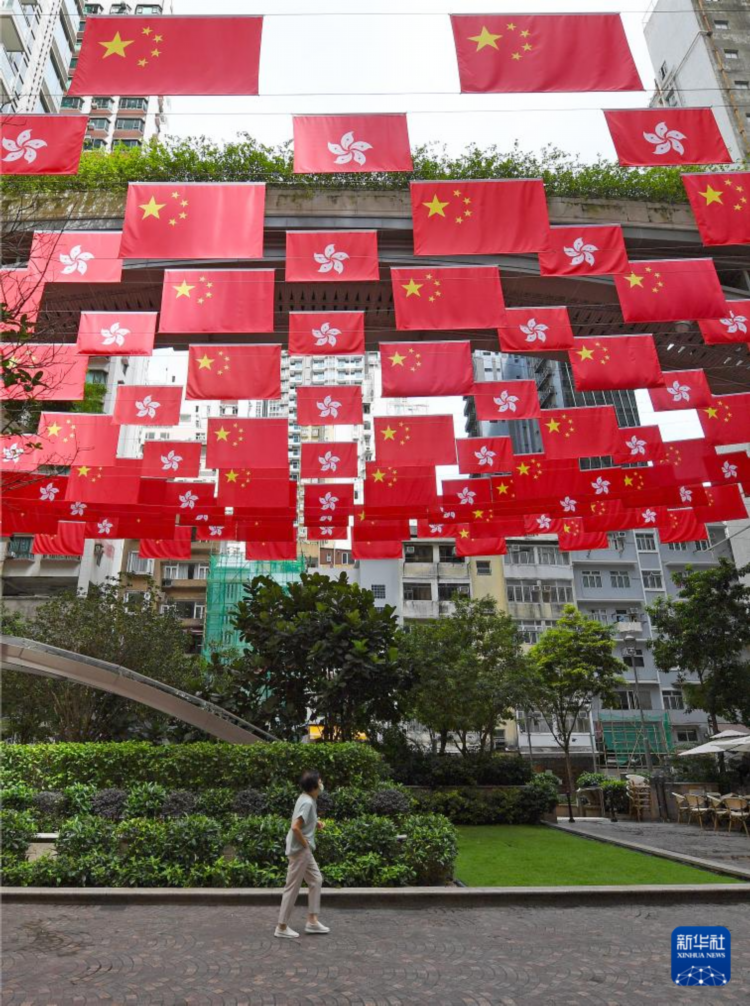 隨著香港回歸祖國27周年紀念日臨近,香港街頭懸掛國旗、區旗,張貼慶祝海報,喜慶氣氛日漸濃厚。