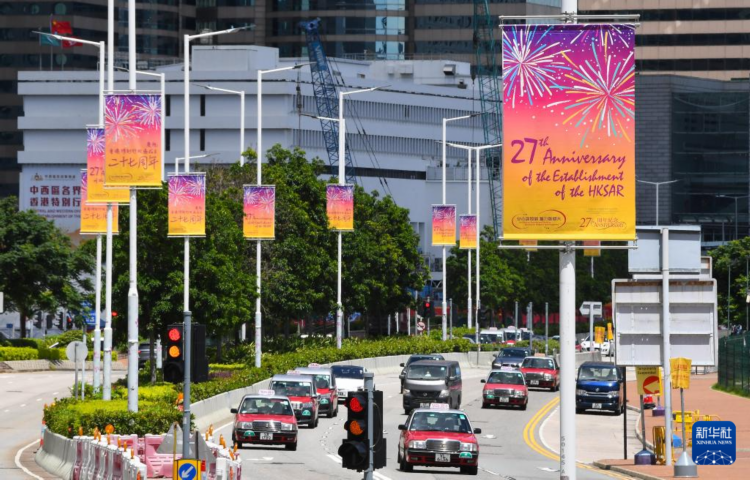 隨著香港回歸祖國27周年紀念日臨近,香港街頭懸掛國旗、區旗,張貼慶祝海報,喜慶氣氛日漸濃厚。