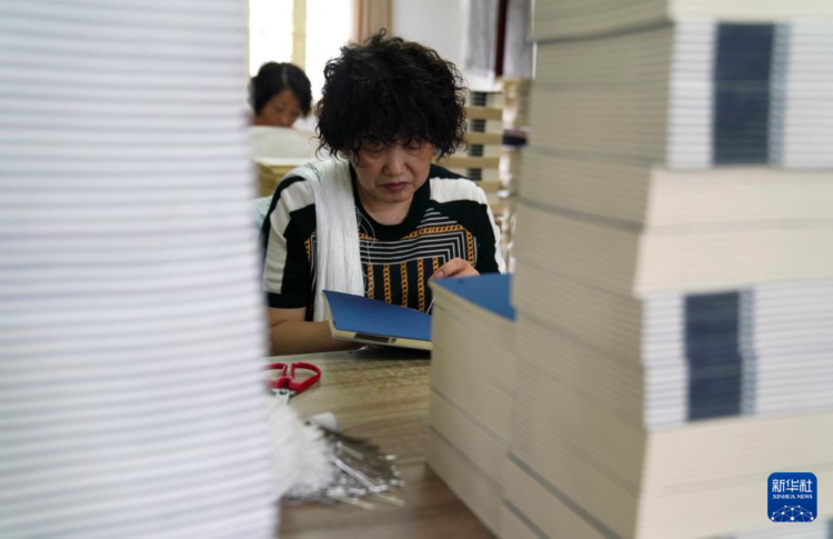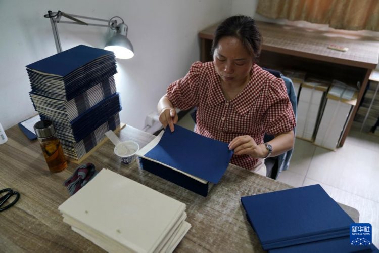 6月27日,在金陵刻經處技藝展示區,工作人員在手工裝訂圖書。