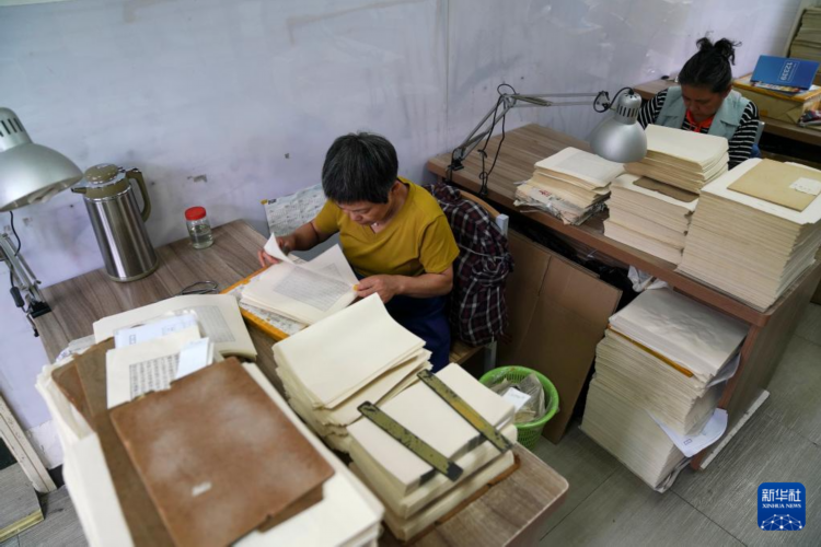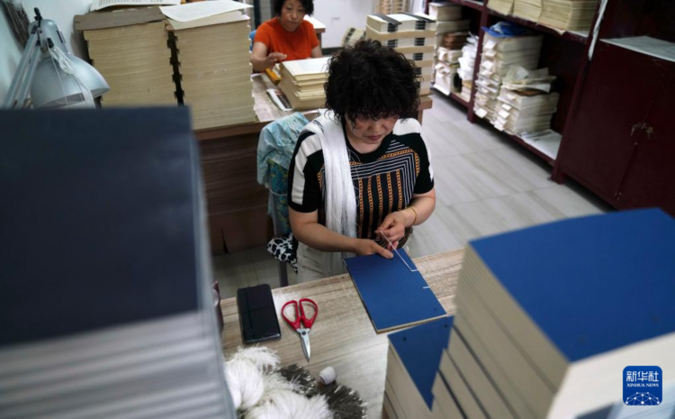 6月27日,在金陵刻經處技藝展示區,工作人員在折頁。