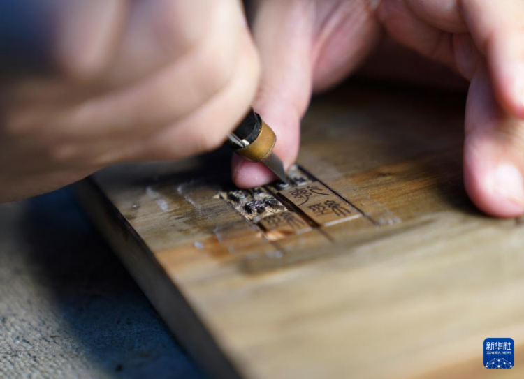 6月27日,在金陵刻經處技藝展示區,工作人員在刻版。