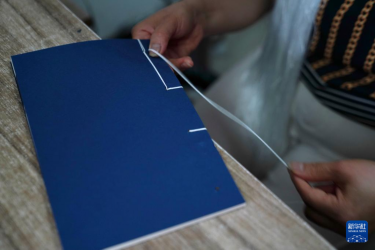 6月27日,在金陵刻經處技藝展示區,工作人員在訂線。