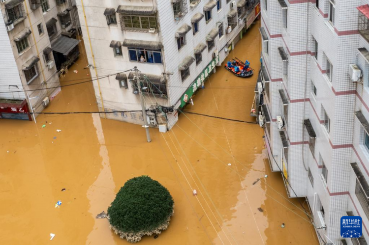 7月2日,在平江縣大橋西路附近,消防員在轉(zhuǎn)移群眾(無(wú)人機(jī)照片)。