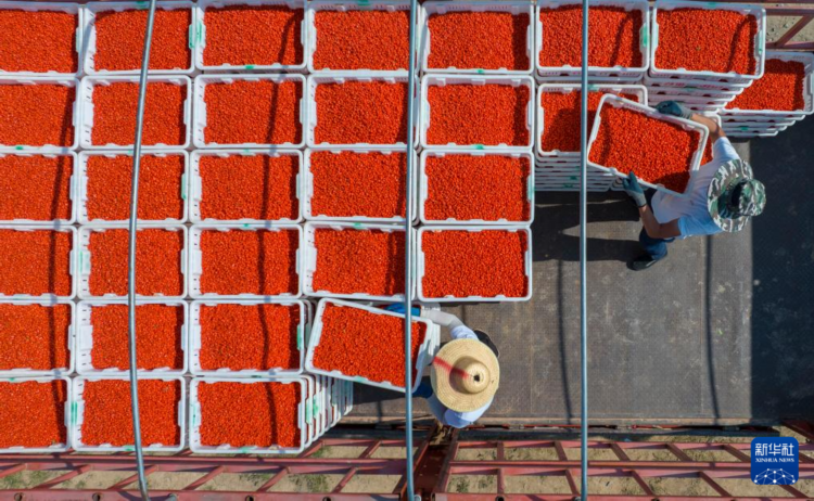 7月11日,在寧夏吳忠市同心縣下馬關鎮五里墩村的枸杞生產基地,農戶將采摘的枸杞裝車(無人機照片)。