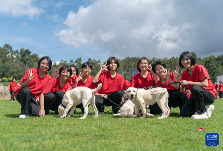 7月16日,幾名華坪女高學生和搜救犬合影留念。