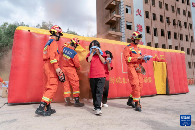 7月16日,華坪女高學生在消防員協助下從消防疏散逃生體驗屋中走出。