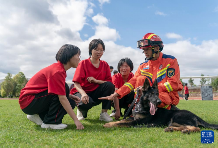 7月16日,一名消防員在給華坪女高學生講解搜救犬相關知識。