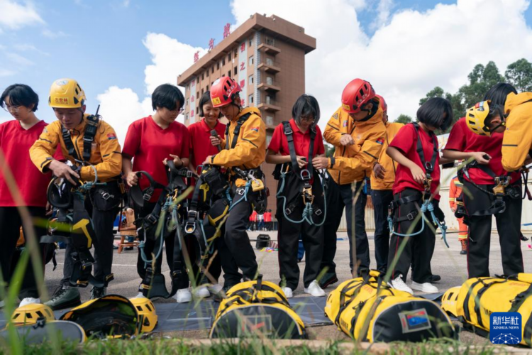 7月16日,華坪女高學生在消防員協助下穿戴安全設備。