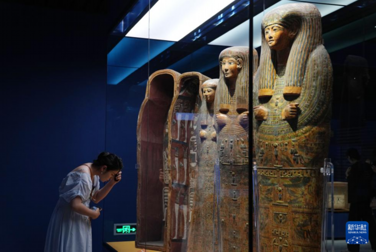 7月16日,在“法老的國度”展區,媒體人員在預覽拍攝佩德阿蒙的彩繪人形棺。