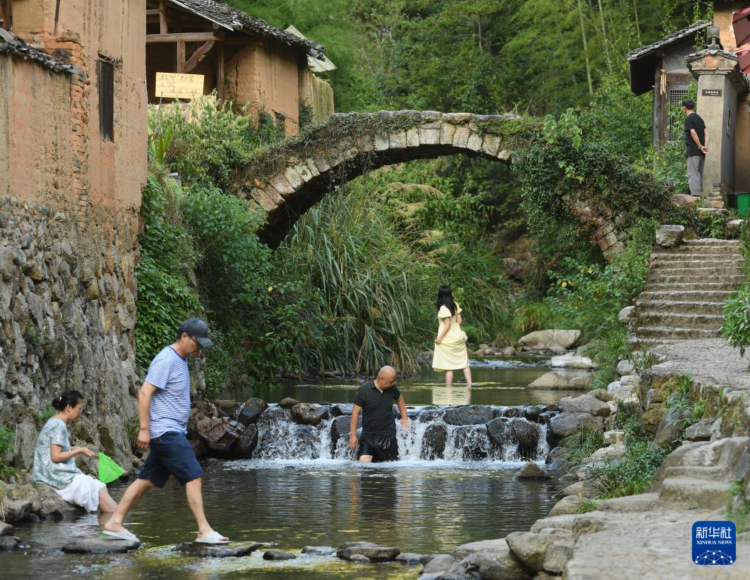 7月17日,在松陽縣松莊村,游客們在村里的古橋下游玩。