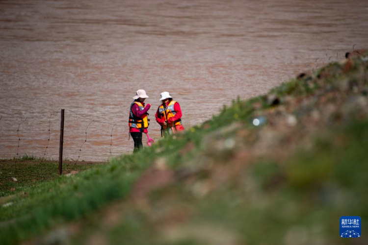 7月23日,在通天河曲麻萊河段,青海省水文水資源測報中心的馬蕊(左)和時璐在進行水樣采集工作。