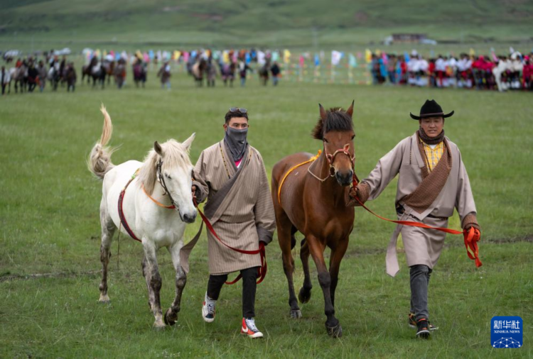 7月27日,兩名藏族群眾牽著馬走進賽場。