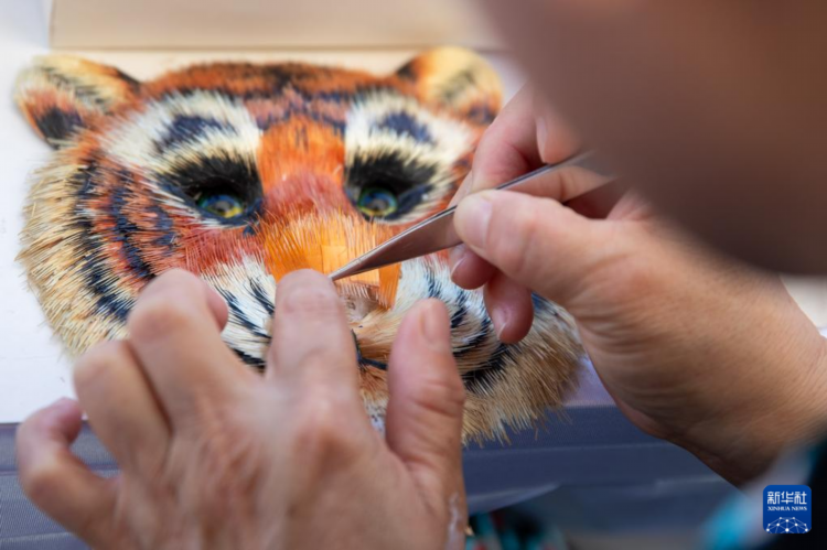 7月29日,在黑龍江東北虎林園,麥秸剪貼手藝人現場制作以“虎”為主題的作品。