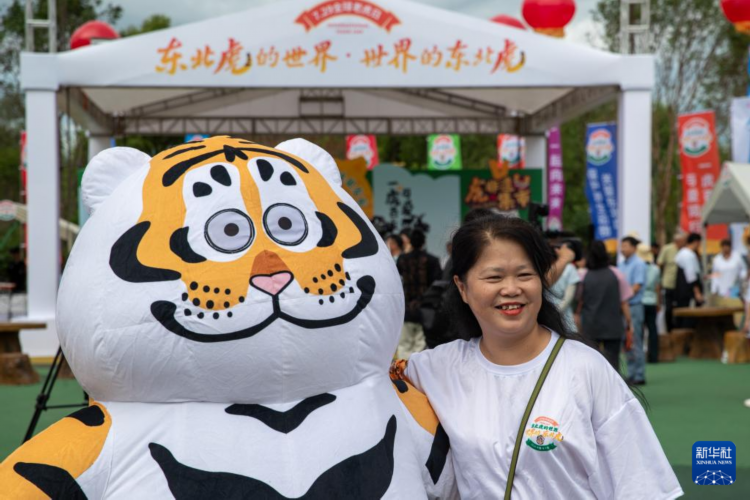 7月29日,在黑龍江東北虎林園,東北虎粉絲現場與胖虎吉祥物合影。